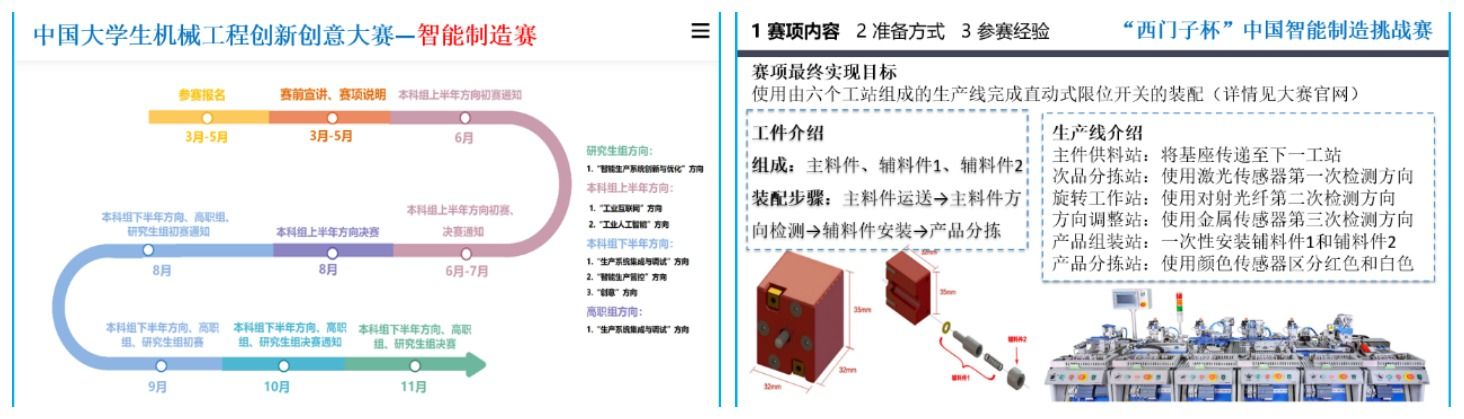 接下来,孙老师详细讲解了“智能制造类科技竞赛”的内容。包括:中国老员工机械工程创新创意系列大赛中的智能制造赛、物流技术(起重机)创意赛、过程装备实践与创新赛,“西门子杯”中国智能制造挑战赛、中国老员工工程实践与创新能力大赛-智能+赛道。结合以往指导比赛的经历,孙老师详细介绍了比赛实践、赛项设置,解读了每个赛项考查重点以及如何备赛。