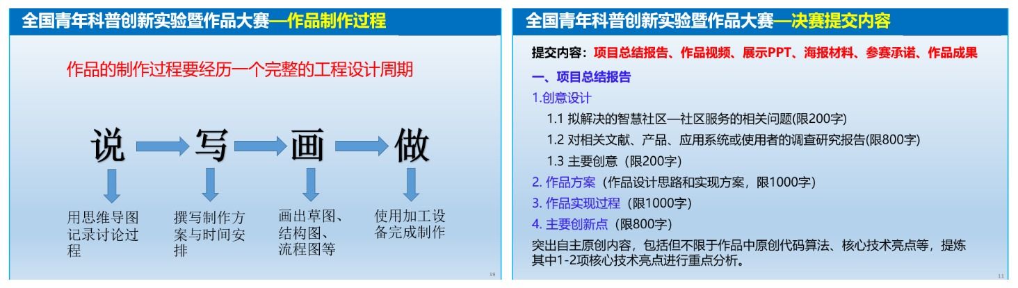 最后,孙老师以全国青年科普创新实验暨作品大赛为例,详细介绍了科技作品的制作过程,重点包括:组队、选题、文档撰写、PPT讲解等环节。结合最近两届比赛获奖作品,解读了“智慧社区”为主题的“具备自动导航及远程监控的智能轮椅”和“人机协作”为主题的“基于数字孪生的多场景停车场人机协同智慧充电展教系统”的选题、加工制作、视频展示等内容,同学们对科技作品的选题、准备、制作、文档整理和视频展示等环节有了深入了解和直观感受。