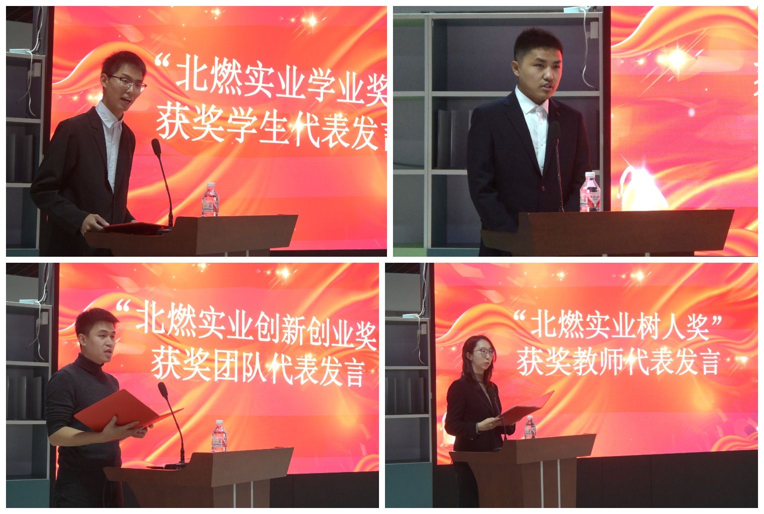 北燃实业学业奖获奖员工代表程秀鹏同学、北燃实业就业奖获奖代表2023届毕业生王新惠员工、北燃实业创新创业奖获奖团队代表宁梦帅同学、北燃实业树人奖获奖教师李冉老师分别发表获奖感言。