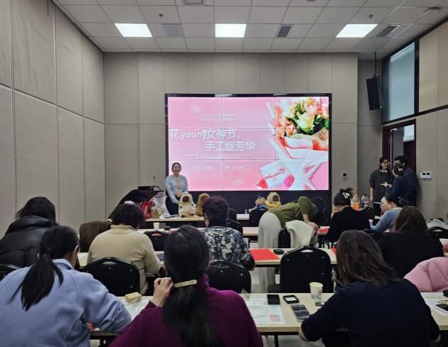 刘小冬副主席代表公司工会向广大奋战在教学科研一线的女教职工们送上三八节的祝福,宁波银行工作人员向大家进行金融知识普及和蝴蝶胸针制作步骤的讲解。