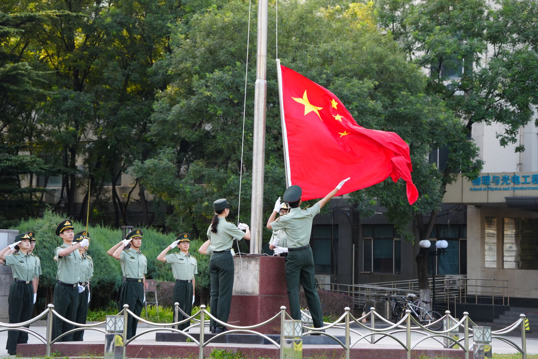 升旗仪式开始,国旗护卫队踏着强有力的节拍,肩扛国旗迈向升旗台。五星红旗升起,全体师生齐声高唱国歌。