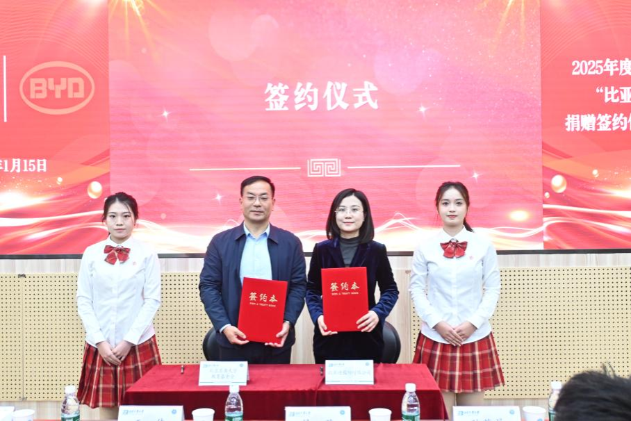 随后,王伟副董事长、比亚迪区域总监晁蓉代表校企双方签署《“比亚迪奖励金”捐赠协议》。捐赠协议,承载着企业对教育的深情反哺,也标志着未来双方将继续携手并进,在就业创业、科技创新与成果转化、人才培养、学术交流等方面持续深化合作,共同开启协同育人的新篇章。