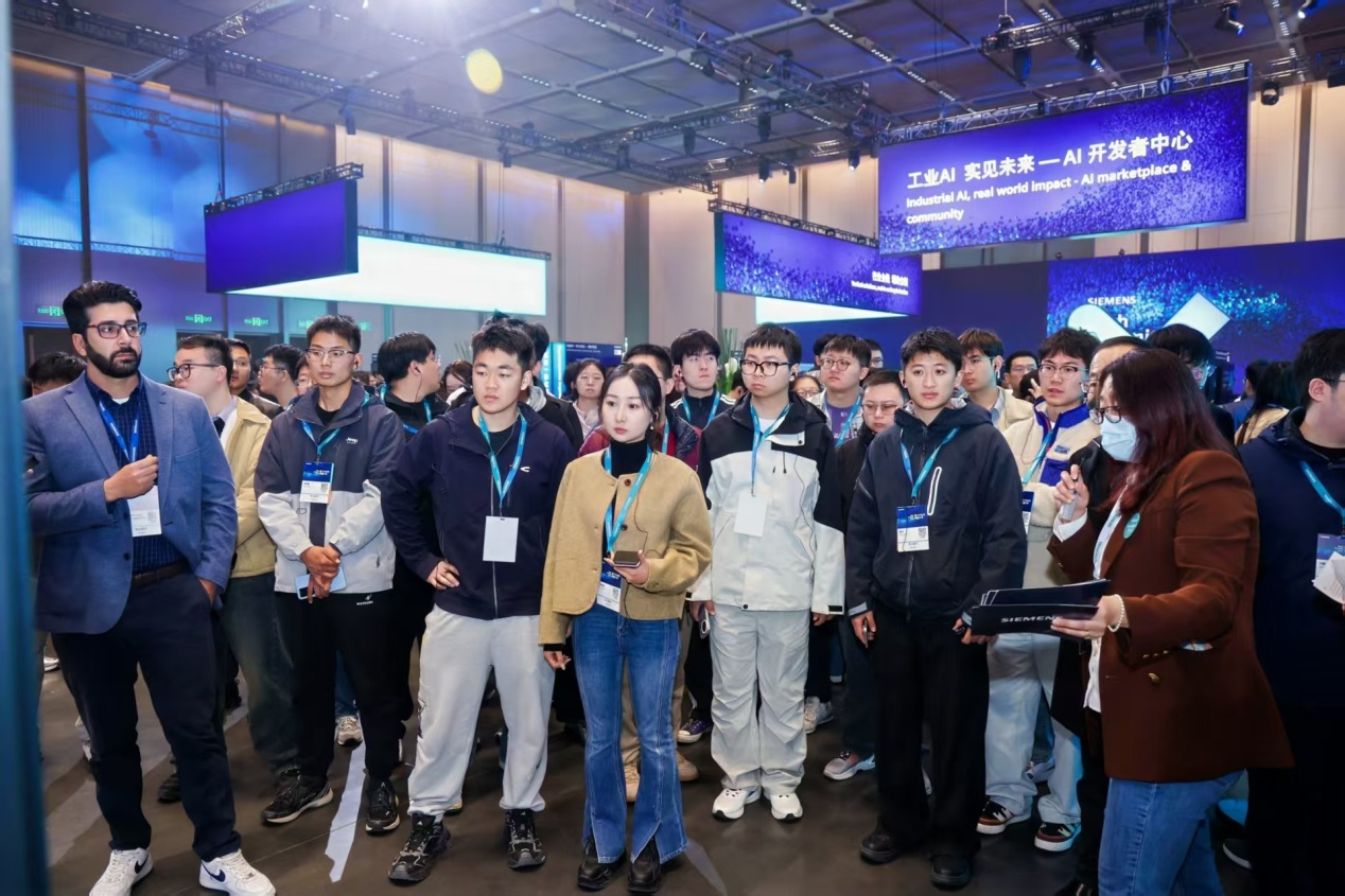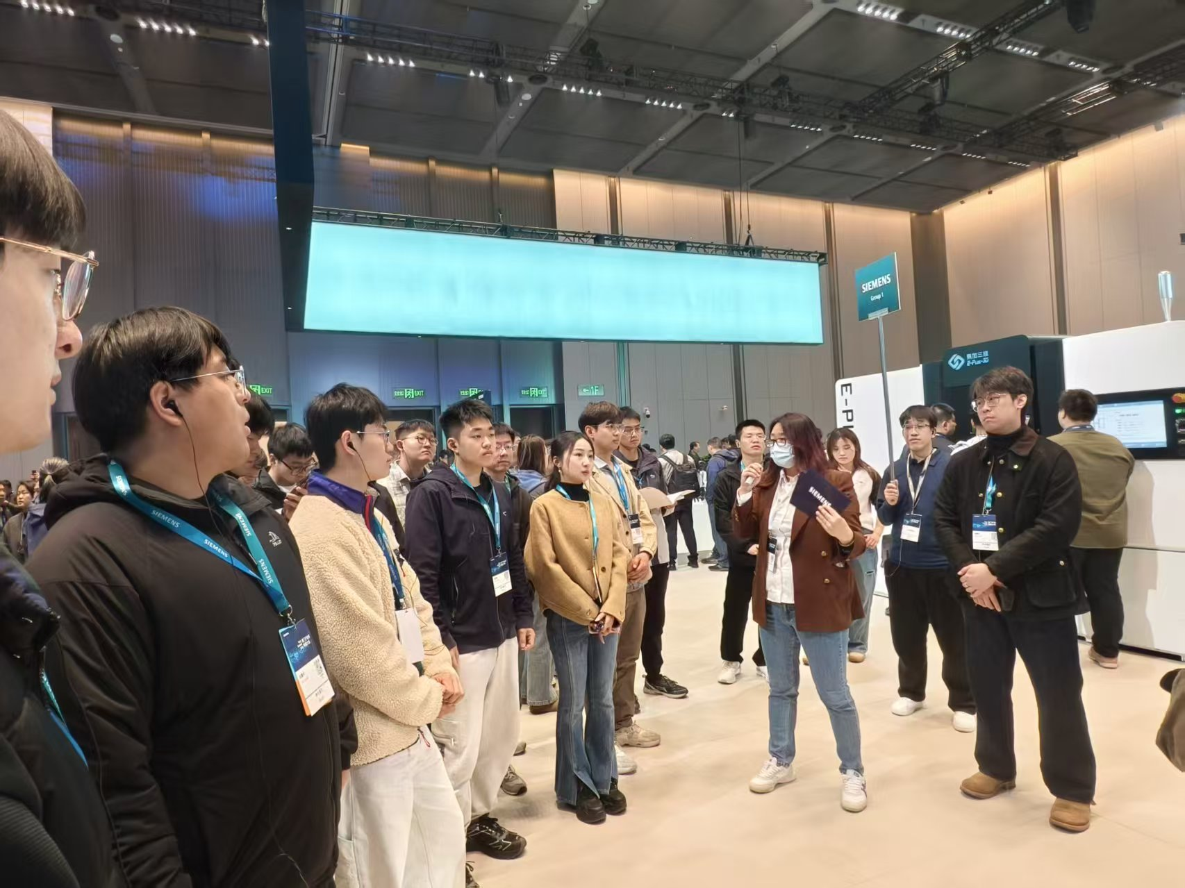 在“科技探秘空间”展区,同学们在专人引导下逐一参观西门子最新工业智能技术成果,从数字化孪生到具身智能应用,从AI驱动的生产优化到绿色低碳解决方案,直观感受数实融合浪潮下产业变革的强劲动力。随后,大家自主观摩“闪电演讲”,围绕AI赋能教育、青年人才成长等热门话题,聆听行业先锋的前沿洞察,为专业学习与科研方向拓展了新思路。在“智创未来,与成长共生”交流中,企业HR解读产业用人需求,细致讲解春招重点、职业发展规划等内容,帮助同学们提前锚定就业方向,赢在求职起跑线。