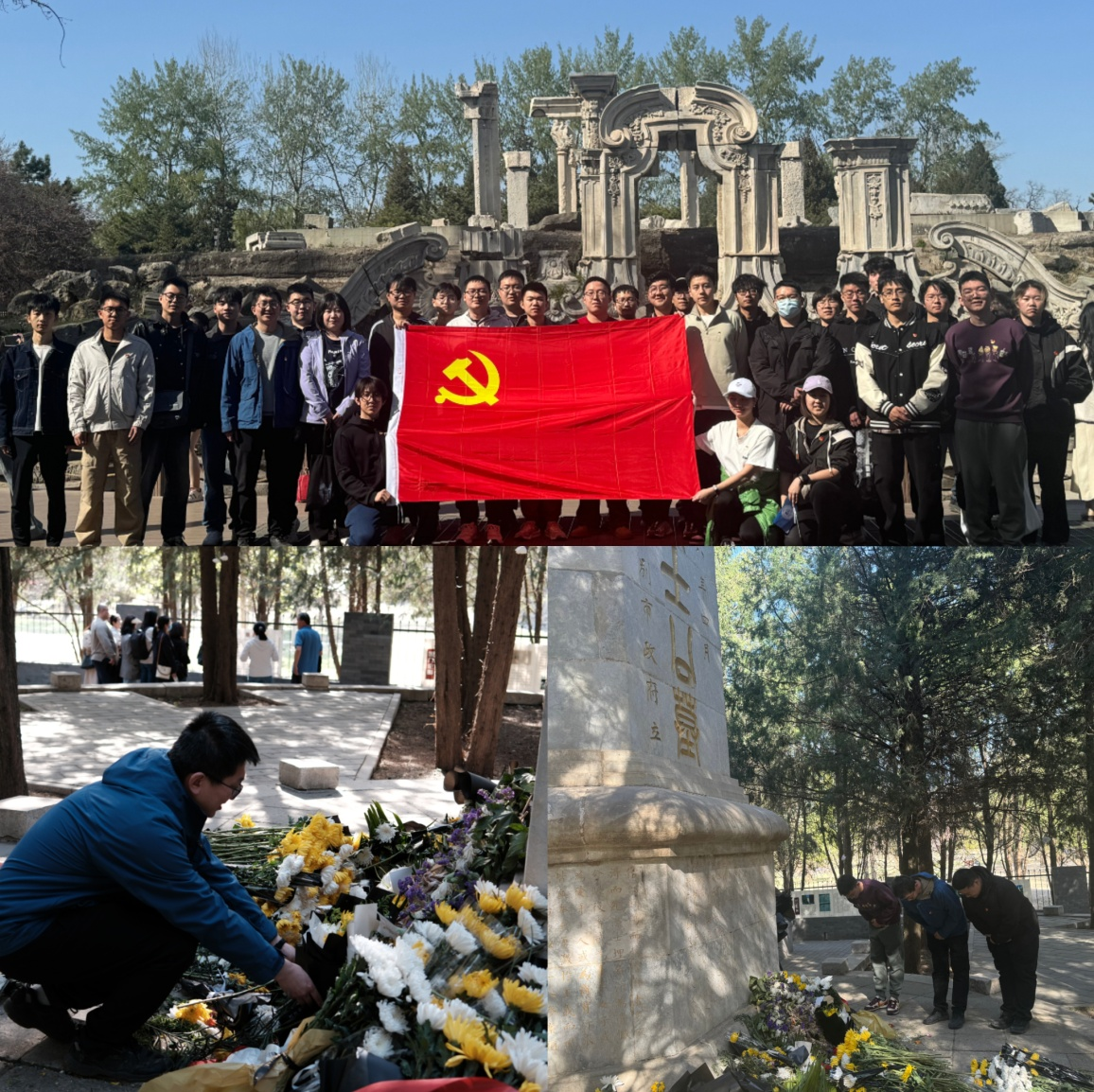 机械本科生第二党支部联合机械电子教师党支部、机械本科生第一党支部清明期间在圆明园“三·一八”纪念碑前祭奠先烈。机械本科生第二党支部书记刘彦辰向与会同志讲解了“三·一八”纪念碑背后的历史,并带领大家向纪念碑三鞠躬以示哀思。机械电子教师党支部代表张国凯老师,员工支部代表袁皓哲、王浩泽向纪念碑献花。